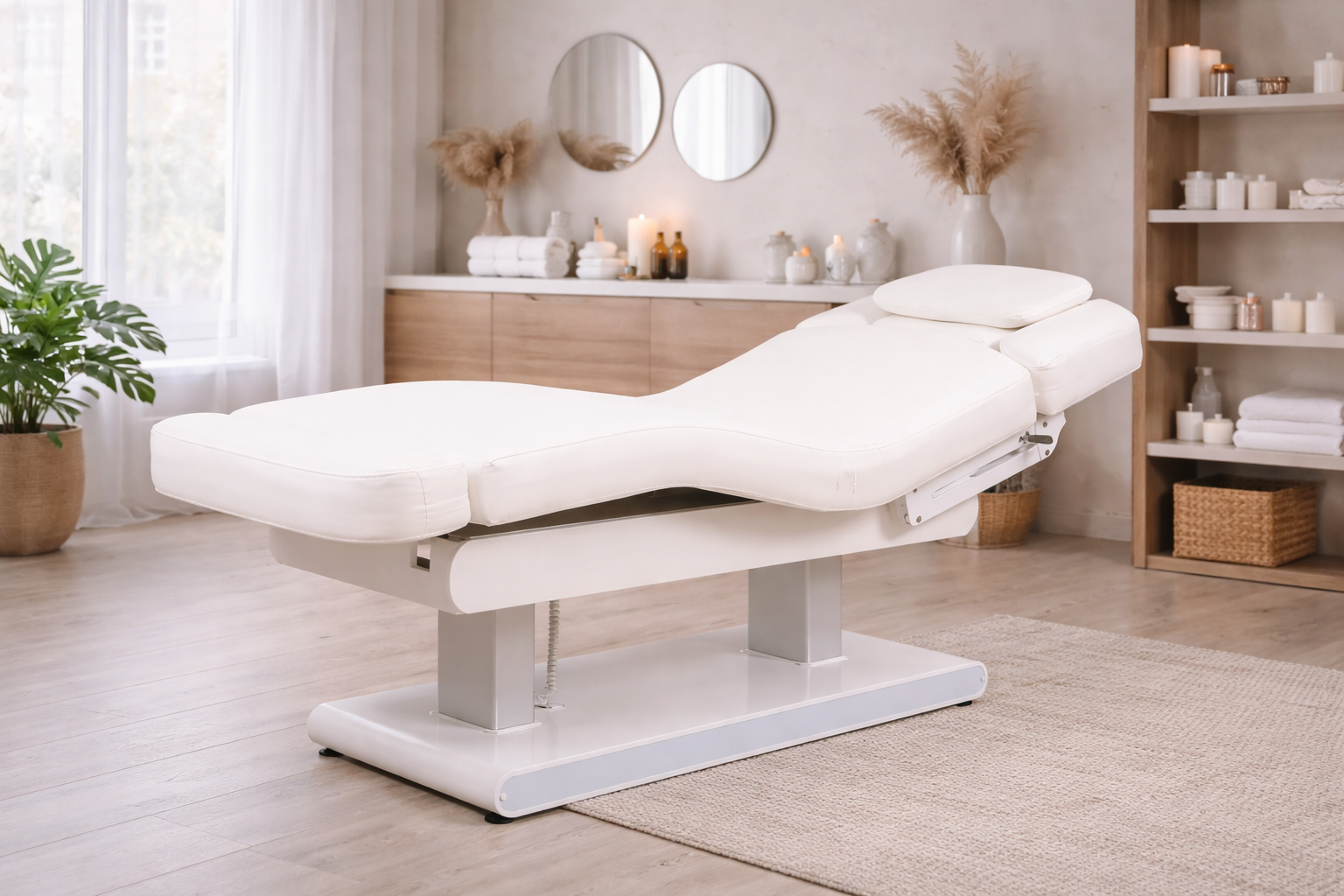 Treatment beds, chairs, lighting, and essential equipment for spa services.